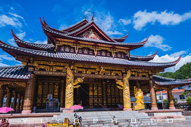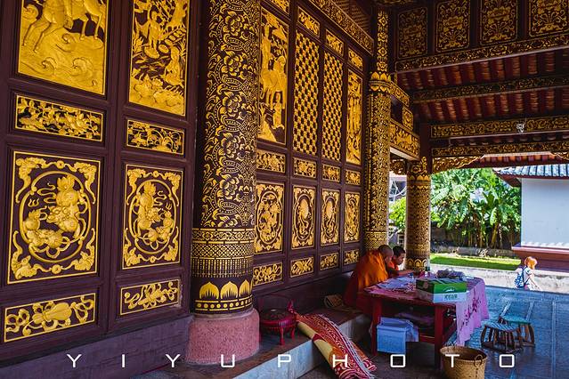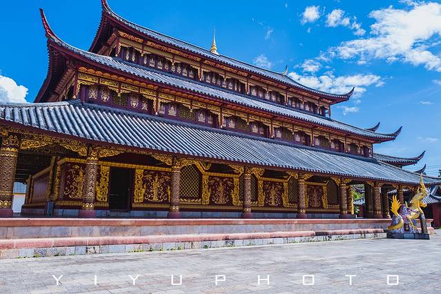 始建于傣历1272年(1910年)。南传上座部佛教寺院,建筑群由大门、佛殿、引廊、八角亭、佛教协会办公室等组成,主体建筑佛殿为抬梁式三重檐歇山顶围廊建筑,内柱6排24棵,柱子、枋、梁、檐檀、橼子均有金饰彩绘图案,设有藏经柜和佛龛,周围悬挂着教徒们敬献的有关傣族民间传说和神话故事的幡,内墙上有傣族民间金水壁画,是研究傣族历史、文化的重要实物。外柱6排24棵,为覆盆式柱础,柱头相镶饰有彩色玻璃仰莲,佛殿隔板外层是用金铂贴印的宝塔、佛像、孔雀、乐舞、花卉等精美图案。屋面以挂瓦覆盖。