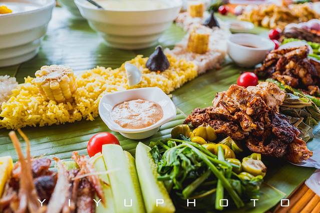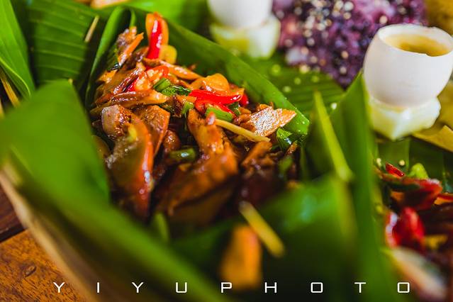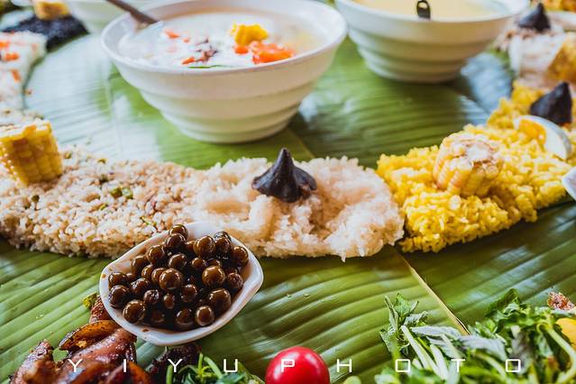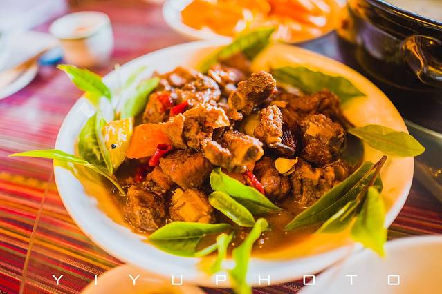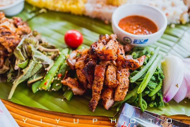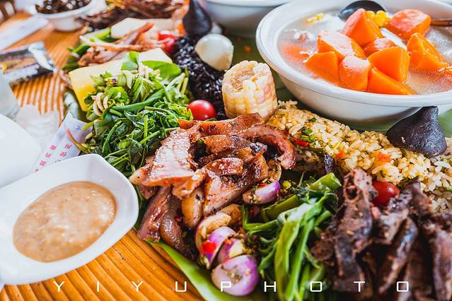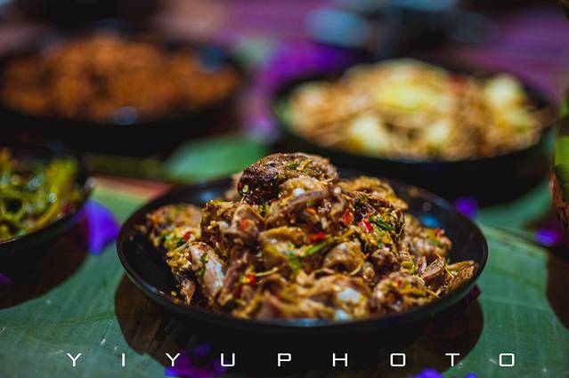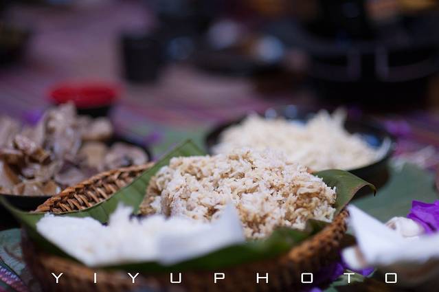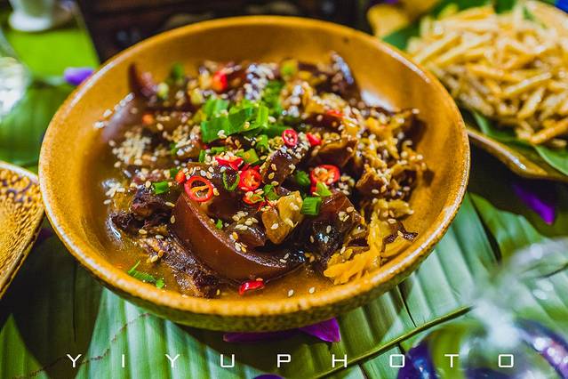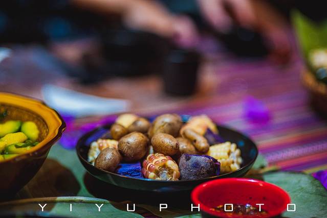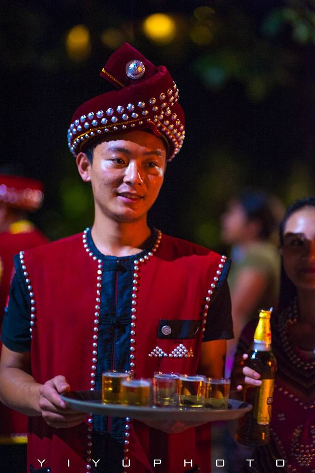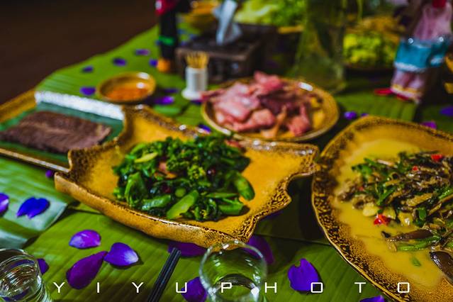 常常的木桌上时芭蕉叶和花布,桌上的美食时云南特色调料制成的牛肉、土鸡、鱼组成主食最有特点的就是烂饭,当地人这种饭时最高级别的盛宴,吃起来果然味道香浓。席间有当地姑娘小伙身着民族服饰进来敬酒。对每一位客人深情真挚的唱出酒歌,酒水香甜,浓情的酒歌将盛宴推向高潮。