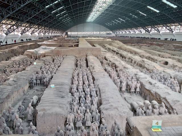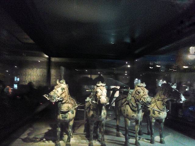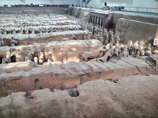 参观游完华清池,坐车来到兵马俑博物馆,让刚刚认识的团友帮忙拍了个到此一游照,便怀揣着一种入宫觐见的心态走进了兵马俑博物馆。小时候课本里的兵马俑,世界奇迹的兵马俑,终于可以亲眼看到了!那份期待已久的心情,在看到兵马俑的无比震撼中久久不能平静……参观完兵马俑接着到参观兵马俑博物馆的展览,青铜马车啊,半蹲着的士兵啊,还有很多兵器之类的文物,数不胜数。整个兵马俑博物馆带给人的除了震撼就是震撼!如果可以穿越回到那个霸气十足的秦皇朝,我甘愿做一名士兵,只为了那一腔热血.......
