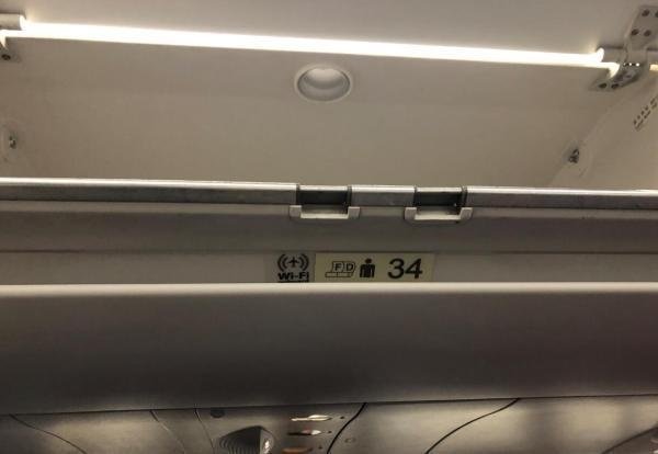 6时28分,某游客登上航班,发现行李架下方,已经标出飞机上可使用WiFi的标识。