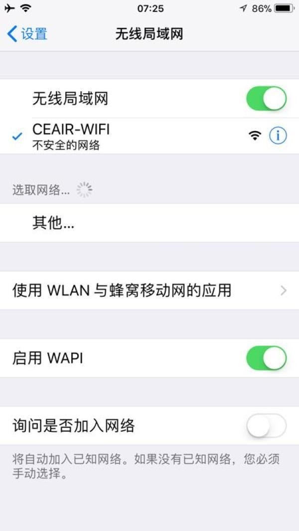 起飞20分钟后,该游客连上了WiFi。体验发现,空中连接WiFi,要先打开飞行模式,关闭蜂窝数据,连接CEAIR-WIFI,在苹果自带safari浏览器中,输入航班座位号,证件号后四位,抢到预约名额后即可使用WiFi。