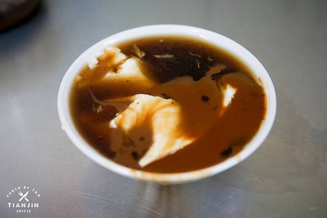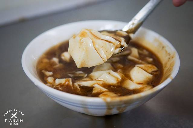 天津的豆腐脑,一碗里基本只有一整块豆腐,上面划个十字刀,呼啦把汤浇上去。没有那么多零零碎碎的小菜,配菜大概只有零星的黄花菜、木耳丝和香菇丝,不仔细看也找不见,汤也不是稀的,而是调过味勾过芡的浓汤,吃起来很实在。根据口味还可以加上辣椒。