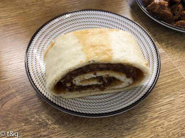 一牙儿烙饼卷两块卷圈。烙饼有韧劲,豆皮脆酥,而里面的杂菜,伴着淡淡的芝麻酱香味,因为被豆皮裹紧了下的油锅,所以水分被锁住,口感依然爽利