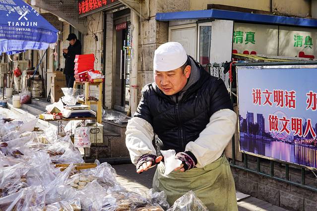 当我们站在天津西北角一家糕点摊前,那个长的很像蓝天六必治广告代言人的老板,自顾自的乐乐呵呵说起了段子,说完了,我们面面相觑,无人接茬时。老板嘿哟一声,开口说:“您们介一看就不是天津人,天津人早麻溜接回来了。”