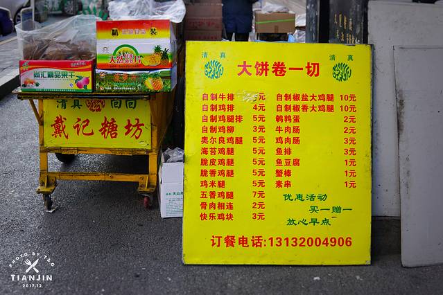 虽然传统的煎饼果子是早餐,而且对食材有严格的要求,但也许是为了迎合年轻人的个性或是其他什么原因,在天津也有些店把煎饼做成了夜宵,增加了食材,口味也有所改良。