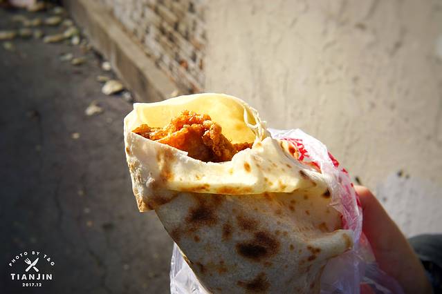 煎饼果子既在天津,自然会用上赫赫有名的天津面酱和蒜蓉辣酱(至少到长江流域的超市里,还可以买到袋装的天津蒜蓉辣酱,有时候会拿它拌面),辣不是重点。当冬天清晨,拿到一个煎饼果子,热气中咬上一口,舌尖感知的是粗粝绵软的饼皮、焦脆的果子/果篦,味蕾混进的前调是咸香、油香、酱香,尔后一点点逼出的隐隐蒜香和辣味儿,这时,再冷的冷空气都成了虚设的背景;