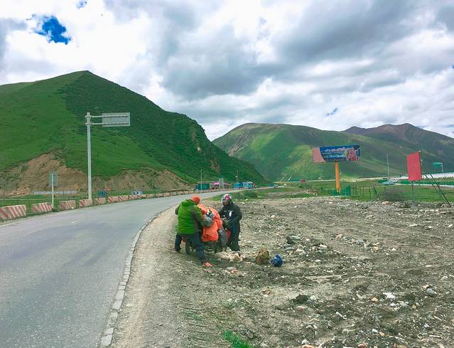 【快跑,跑出这片云便是晴天】高原气候真的很美妙,不用担心下雨,下雨了就跑啊,跑出这朵乌云便是晴天,在翻折多山之前停车休息,刚下车,大雨便至,只好开车就跑。跑一会儿就将雨留在了身后,我真是太爱西藏的天气了。后面遇到的三轮小哥们在此地遇到的却是冰雹。“前方的云不知能带来雨是冰雹还是雪。”高原就是这样,你不知道哪朵云给你带来什么。