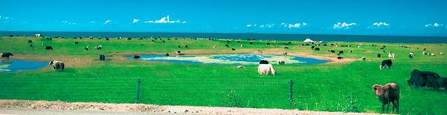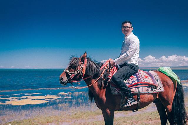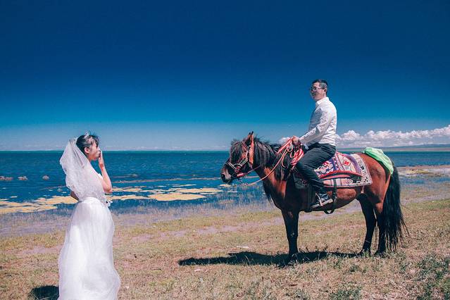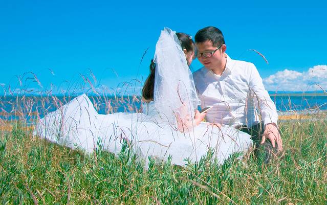 第二十二天:茶卡到西宁,途径青海湖,茶卡一过,感觉就打破了人间与仙界的结界,哆啦A梦任意门一传送便逃离荒漠,来到青海湖地盘天空都蓝的不一样了,一路草原风光翻过橡皮山。虽然看过了各种辽阔大草原,但是当经历了几天荒漠之后再次见到这样美的蓝天草原时又有了初见时的冲动。谁说见过了最美的东西之后就不容易被打动,其实只要足够美,都能找回初恋般的感觉。但是,今天我们确实是带着任务来的,我们要去拍婚纱照啊,但是从茶卡出门比较晚,到达青海湖周围时已经午餐时间了,也就没时间去草原上打滚了。青海湖是真的很美,草原也是真的很美,美中不足的是各个领域都被藏民圈地保护,不能沿湖边逛,进到湖边都要钱钱,但是不贵,我们随便选了一个人不咋多的湖边进去拍照,拍了一会儿牵马的过来了,问骑不骑,一直坚持不骑,只到问了很多次,然后还说了很多听不懂的话,我们听着貌似是不骑马我就哄你们出去,不要在这儿拍照之类的,所以立马上马,给钱走人,再也没有被打扰了,还是耿直。沙岛也一样。青藏线给人的感觉真的是景点人扎堆,不自由,还是遥远的西藏纯粹,各大免费景点玩到high爆,青海湖的日落也由于地段没选好只看到了晚霞。