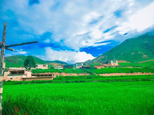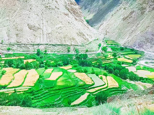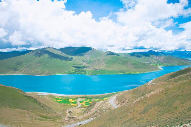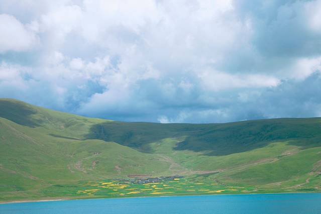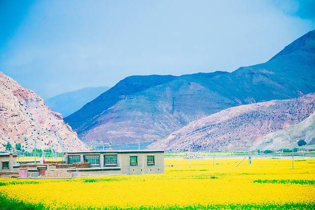 上到极冷的山顶,接下来继续走着一路油菜花青稞地,邂逅了不知名的翡翠色小湖和深奶绿色的满拉水库;到了江孜古城,两旁的油菜花更美。