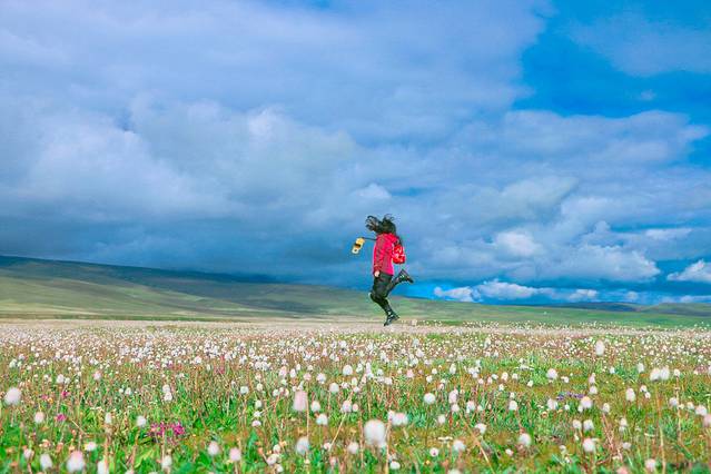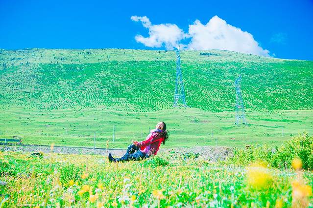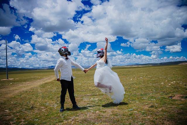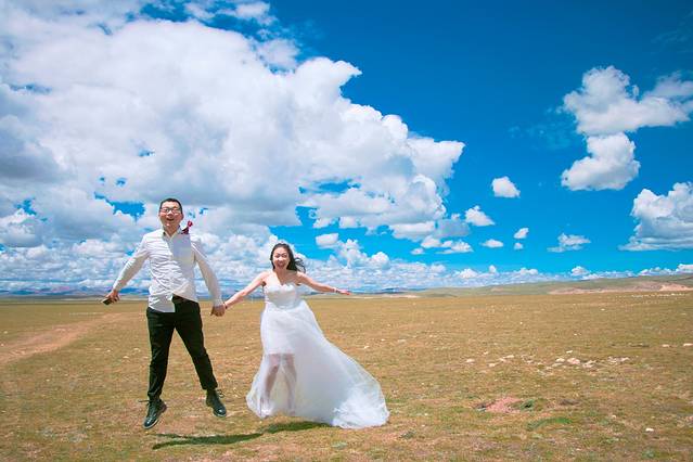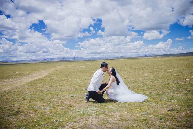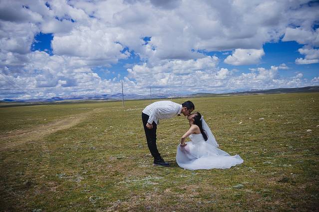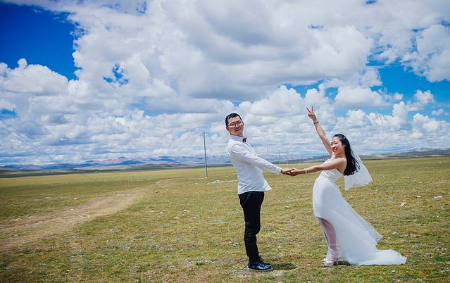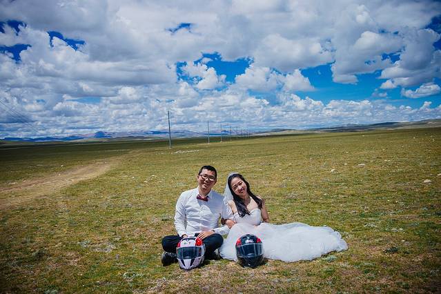 一直嚷嚷着要在大草原上拍一组婚纱照的木子木木夫妇终于决定在即将驶离西藏境内的最后一片大草原———那曲高寒草原上拍一组圆梦。于是乎,随便找了片平的,就开始卸行李,换衣服,支三脚架……速度惊人但却无人可惊,因为除了有过路的车车外,你根本见不到人来偷窥你换衣服,一点不用担心走光,也一点也不用担心会害羞,更不要担心有好心的路人甲走过。除了蓝天白云青草地外就只有木子木木和小黑。那就high吧,前方高甜狗粮来袭哦……