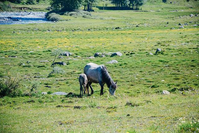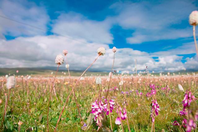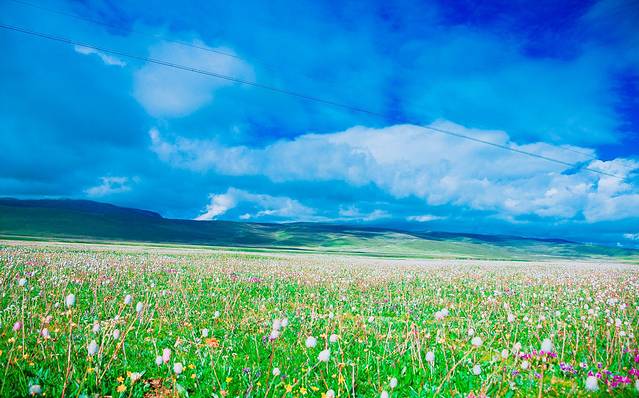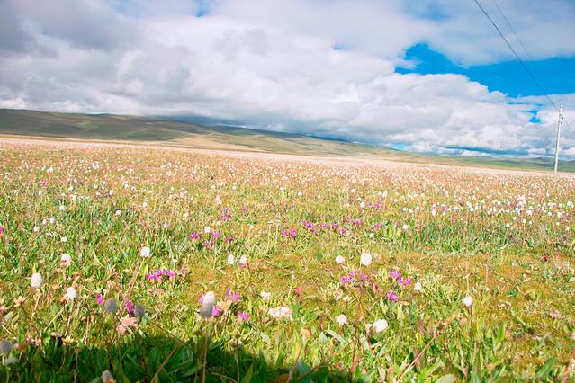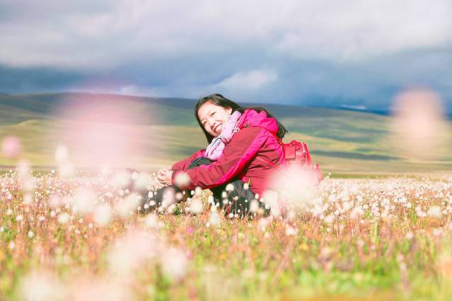 从昨天晚上开始就有了今天的无数个期待(不也许更早),最最最期待的还是传说中开满野花的毛娅大草原,由于那梦幻的童话般的花海(每个拥有一颗少女心的人都无法逃离对花特别是花海的爱),我们准备拍第一组婚纱照。但是从理塘出来,走了不多远就有一片连绵不绝的野花草原,浅薄无知的我们信了度娘中的搞错了方向的某人,一直以为毛娅大草原还在前方,于是乎一直开一直开,直到我惊觉那片花海定是毛娅大草原的一部分的时候停下车来拍了一会儿照片,但是天公不作美,阳光只漏了几丝下来,于是我们决定继续往前走到天气更美花海更盛的地方在拍婚纱,直到走到没有花海,继续走到下了高原,继续走到山谷才意识到我们就这样完美的错过了毛娅大草原婚纱梦。我真的只想感叹这片土地之大,才让这么美的风景没有风景标识,如果是城市里,它早被圈起来收不知多贵的门票,所以要看风景还是要走出去。