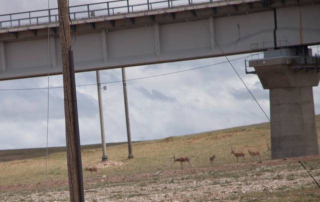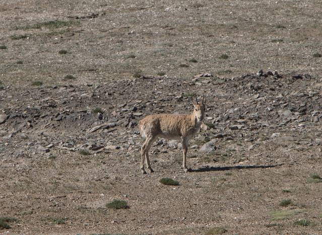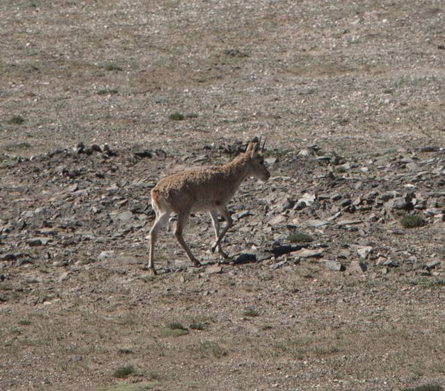 第一次看到铁路高架桥下面的一大群,远远的拉近尽头排到了几只。第二次就在隔的特别近的路边的空地上躺着,但是司机木木专心开车,速度太快,没有停下来看看。第三次我们热情的给对面骑行的朋友打招呼时,他提醒我们藏羚羊,路边的湖边躺着一群悠闲的晒太阳的藏羚羊,依然是因为司机太专心没拍。第四次,远远的落单的一只,当我拿起镜头走过去时,它好像很害怕的跑了起来,但是看我站在原地并没有要追逐伤害它的意思,他便停下来看着我,就这样远远的看着,仿佛看到了人与其的和谐共处,看到了再也没有伤害的可可西里,相信志愿者们的努力和人们的良知已经让可可西里不再流血流泪。
