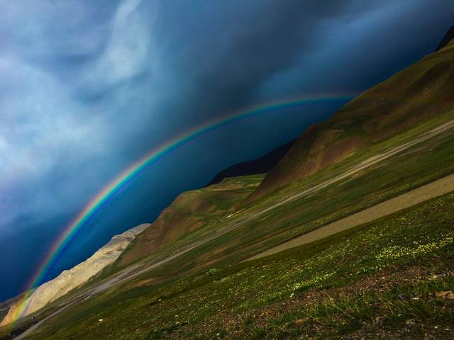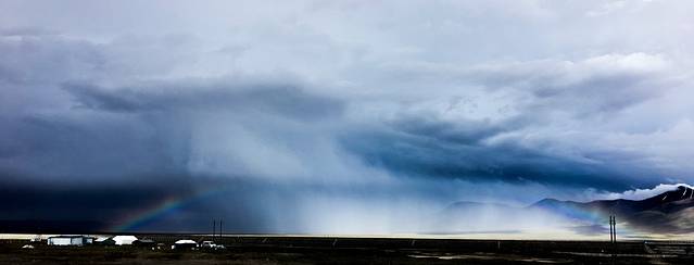 今天睡到自然醒,然后从那曲到雁石坪,一直走G109,一直在海拔4000+的高原上行驶,青藏高原的风光真是无限好,一天四季一点儿不假,中午在安多草原拍了第二组自拍婚纱照,然后爬上唐古拉山,遇见了彩虹,今天真是彩虹之日,从最开始遇见半截的一个霓,一个虹,然后看到它沿着青藏铁路铁轨慢慢消失后又遇见更长的彩虹,在最后居然遇见了两条完整的彩虹,真是幸运的一天。晚上宿海拔4700的雁石坪。