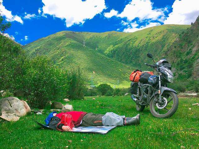 路遇两帅哥,因为同为渝A的牌照便以为是重庆人,实际上他们是深圳的,因为深圳禁摩,所以在重庆买的车打算骑去拉萨,看到我们两个人加一大车行李骑一个150的摩托便开始替我们打退堂鼓,他们说的我确实以为我们的摩托会到不了,我还准备翻不了折多山我就搭车去,让木木一个人骑,但是木木酱却说只要想去任何车都可以,事实证明他是真理,他也不可能丢下我。但是那天晚上我还是辗转反侧祈祷顺利翻越折多山。【被吓到实在是一晚上没睡着】