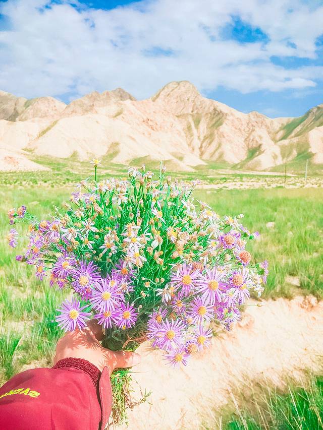 由于实在是无聊困,木木酱停车打盹儿,我相中了路边的野花花,做了一个手捧花,打算拍个戈壁荒漠大气的婚纱照被无情的拒绝了。于是只好一个人无聊的玩花花。