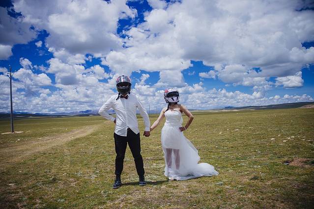 非常喜欢这组本次唯一的摩托元素照。有点遗憾的是本来还打算在青海拍一组摩托元素的公路婚纱大片,but各种原因无疾而终,于是乎只留下这一组在海拔4000+青藏高原上拍的,史上有且仅有一次的唯一的独特的摩托婚纱。