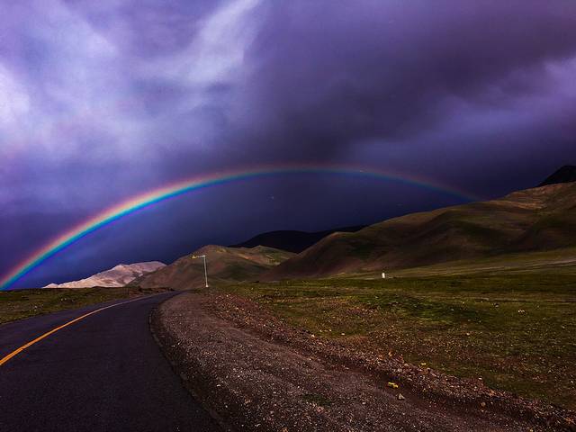 后面的半天都在遇见彩虹,幸运的我只好默默感谢上帝。青藏高原的确美妙多变,每一天的风景都不一样,比我们提前一周的小学同学遇到大雪纷飞;同行的未到珠峰提前回程的摩友遇到冰雹;……还有好多不认识的旅人遇到了我不知道的天气;而我遇到的却是一天的彩虹,所以何其幸运,何其幸运……作为雾都的小盆友,真的没有见过大世面(重庆的彩虹对我来说都被雾遮住了),所以当刚刚遇到那一条残虹的时候,我就开始兴奋的快要跳下摩托……