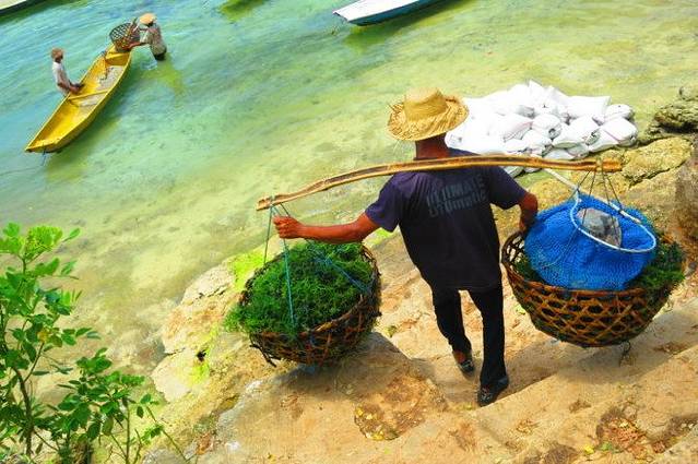 种植海藻是蓝梦岛居民的主要收入来源。看起来很辛苦却又带着很多诗意。古老的编筐,绿莹莹的海藻。将海藻农场里的海藻装在框子里运回岸边,接下来就要晒干。