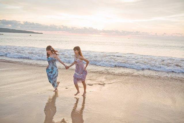 等待日落的两个姑娘先自顾自的奔跑在沙滩上。
