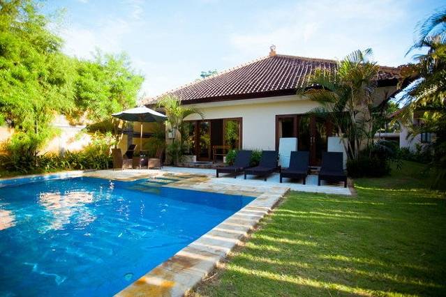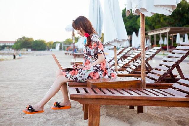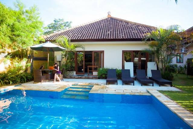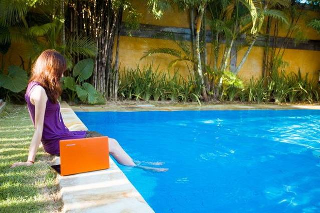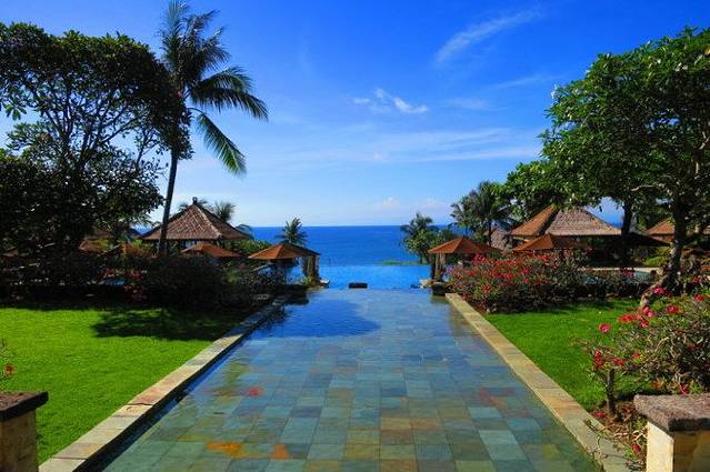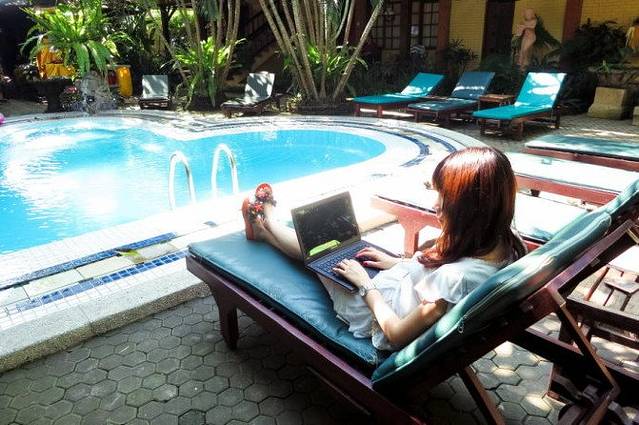 人家都说巴厘岛一定要泡酒店的,所以今天我们准备好好享受一下巴厘岛最好的海滩和美丽的酒店,坐在泳池边上网是件开心的事。