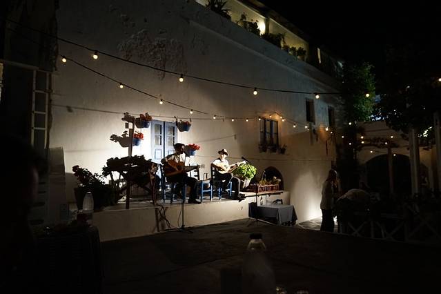 剧场为我们特地安排了乐队的附近,据说是听说我们中有音乐家,其心细可见一斑。桌子上已经摆放了圣托里尼传统meze(小碟子装的各种当地美食)和当地葡萄酒,宾客落座,主人开始招待,新郎新娘开始挨桌敬酒。其间,希腊人热爱音乐舞蹈的天性表现得淋漓尽致,以美酒歌舞助兴,婚礼热热闹闹的。