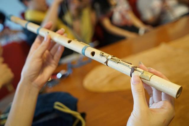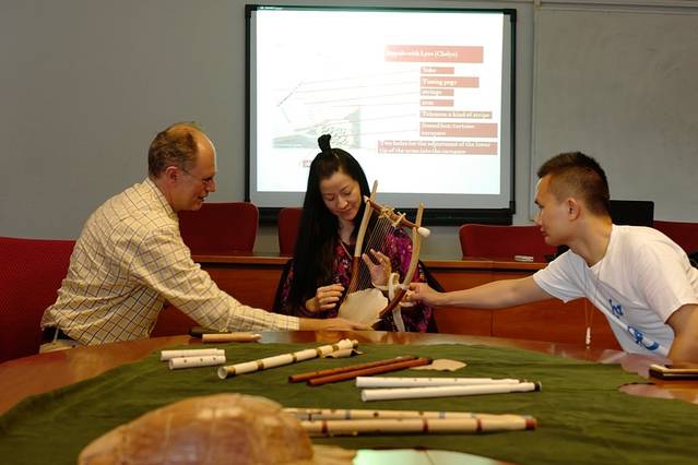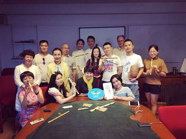 在桌子上摆放的就是这一年来的部分成果,我们自己也拿起里拉琴和管乐试着演奏,其中的阿夫洛斯管吹得我们腮帮子都酸疼,这才知道这个乐器的演奏原来这么难,也明白了为什么在古希腊陶罐上那些吹阿夫洛斯管的人像脸上都会勒着皮筋。教授结合实物,跟我们分享了很多古希腊乐器的故事。