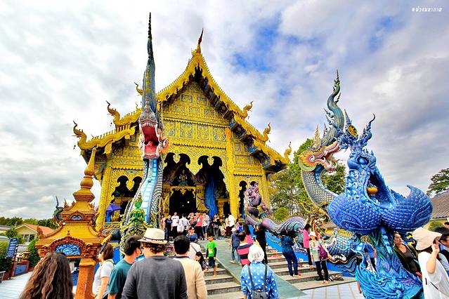清莱蓝庙不是清迈蓝庙,清莱蓝庙叫Wat Rong Suea Ten,是由白庙主人的徒弟设计建造的。虽然面积和历史都没有清迈蓝庙大和久远,还是可以看出清莱蓝庙的设计者也花了很多心思在上面,雕塑上都混入了银粉,所以看起来闪闪发亮的。