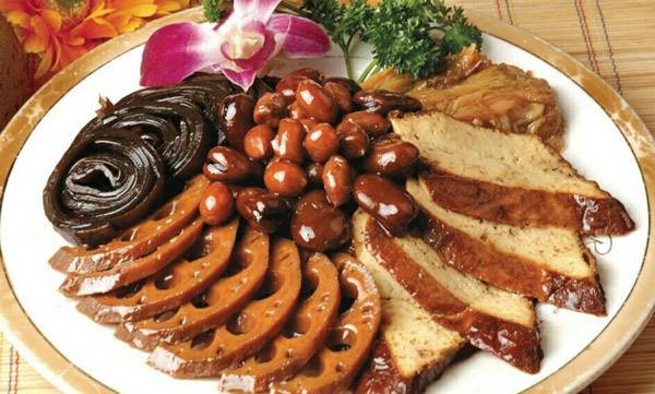 等到除夕夜,扬州人一贯对事物的热情就全爆发出来了。年夜饭的菜一般取双数,冷盘8个、烧菜4到8个、炒菜4到8个,还有些汤汤水水。之前早就腌制好的腊肉、风鸡、咸鱼、火腿、灌晒好的香肠等,都被或切或撕地一碟碟端上了桌,这是先锋;之后便是各式各样烧、煮、煎、炸的食物,花样繁多、香味诱人。鱼是必不可少的,取“年年有余、吃余粮”之意,意味着来年不会饿肚子;还有晶莹剔透的镇江硝肉(又叫“肴肉”)。这里不得不提几道必不可少的素菜: