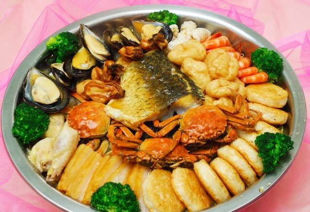 如果更讲究的,或者在一些客家人的家庭里,盆菜也是年夜饭的主角,这道粤菜里独特的风景线,做起来大费周章,但无论形式还是内容上,都让人感觉一盆喜庆。盆菜是将多种食物堆积在一盆里,传统盆菜在用料方面,猪、鸡、鸭、海味、冬菇、猪皮、枝竹、萝卜、生菜等不可少。讲究荤素结合,以免过于油腻。每一道菜肴都经过事先烹制,所以有“做一个盆菜等于做10道菜肴”之说,每道菜肴分别烹制好后,再一层一层叠进盆中,最下层放的是容易吸收肉香与酱汁的材料,如萝卜、猪皮、枝竹、生菜等。再放鸡、鱼、肉等,通常越是名贵的菜肴,就摆在最上层,一是这些菜肴都经过特别烹制,摆在上面不易掩其真味,二是为了卖相好看,以显示该盆菜的豪气与用心诚意。