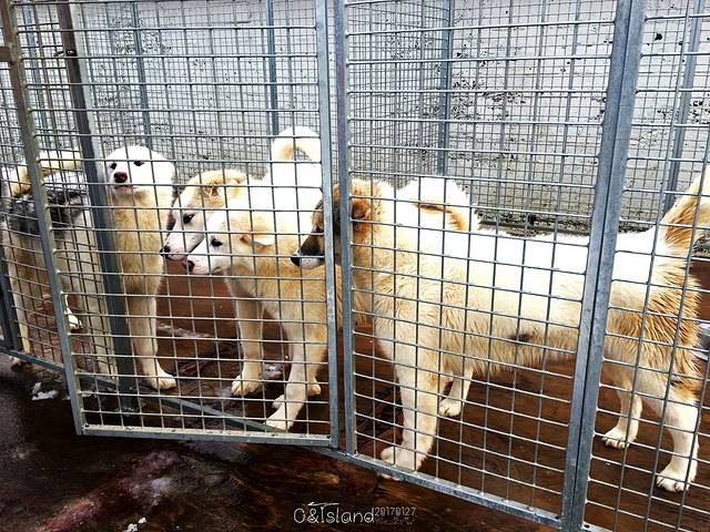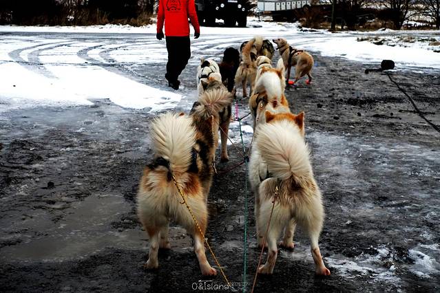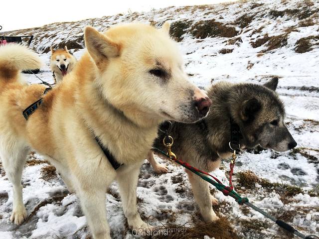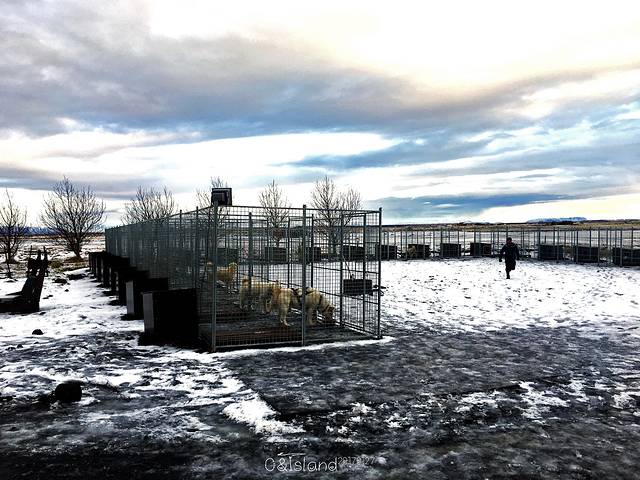 作为一位爱狗达人,我对狗拉雪橇抱着一百分的期待。一般在夏季参加狗拉雪橇活动因为气候稳定,可以确保在雪地里拉雪橇。而冬季因为冰岛气候变化快,雨雪会破坏适合拉雪橇的厚厚的雪地。所以最终我们没能在雪地上拉进行狗拉雪橇,而是在结冰的旱地上进行。早上越野车接送,一共三个家庭,我和小伙伴算一个,另外有两个爸爸妈妈带着孩子的外国家庭。拉雪橇的时候一单一车,对体重有限制。我们三个人坐一辆雪橇车,十条雪橇犬拉一辆车,驾车的小哥一路呼喊着每一只狗狗的名字来控制雪橇。两侧风景开阔,一路上冷风呼啸,挺冷的。。休息的小屋子里提供热巧克力,狗拉雪橇完成之后会回来休息一下,然后带我们去看五只小狗。恩,以我养狗的经验,我觉得小狗五个月差不多,我刚和小伙伴说了我的推测,小哥就介绍了这五只五个月大的小狗。 小狗们很活泼温顺,他们围绕着我的双脚,把我新买的UGG上的翻毛啃掉了两搓。。。