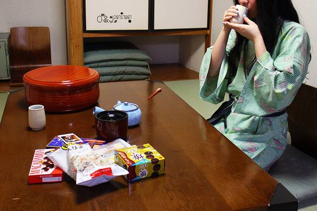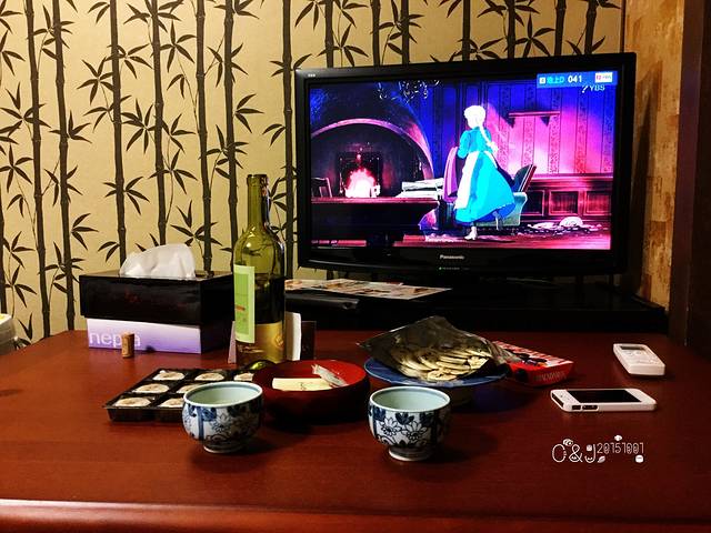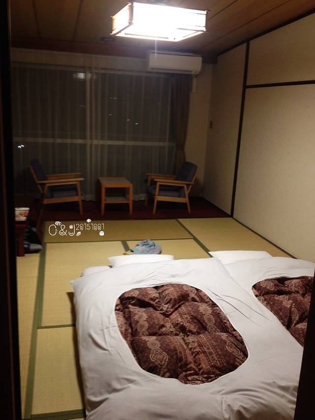 房间挺大的,我们住的是日西式客房,就是一部分是榻榻米,一部分则是席梦思床。房间没有电热水壶,都是前台烧好了送到房间里,浴衣和毛巾也都是前台在客人到来前就准备好放在床上。