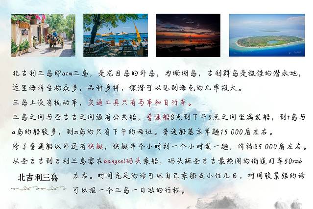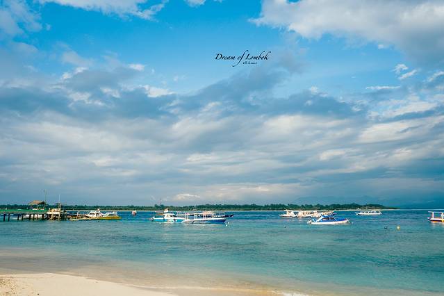北吉利三岛分别是Gili Trawangan、Gili Meno、Gili Air,其中t岛距圣吉吉最远,a岛距圣吉吉最近,m岛居中且是最原始的一座岛,岛上有一片内湖,我们很想去看看那片湖,但来到码头后才知道bangsel码头到m岛只有下午有船,于是改变主意前往a岛。