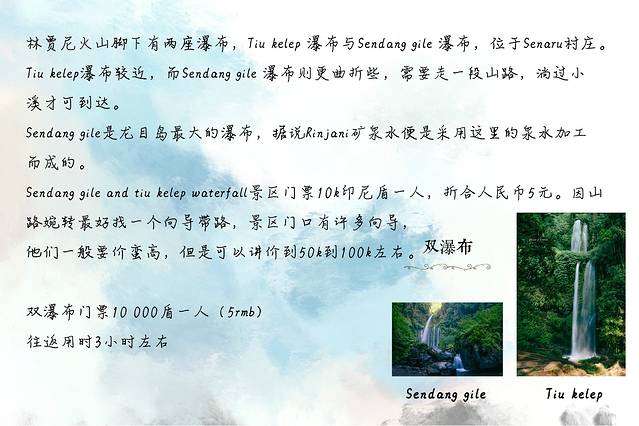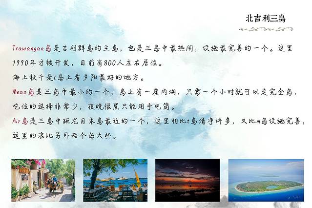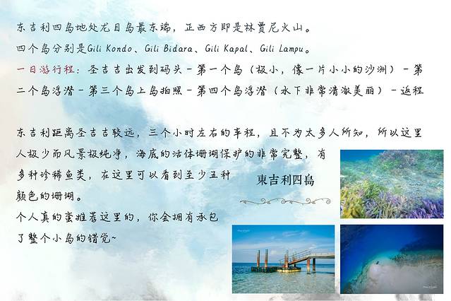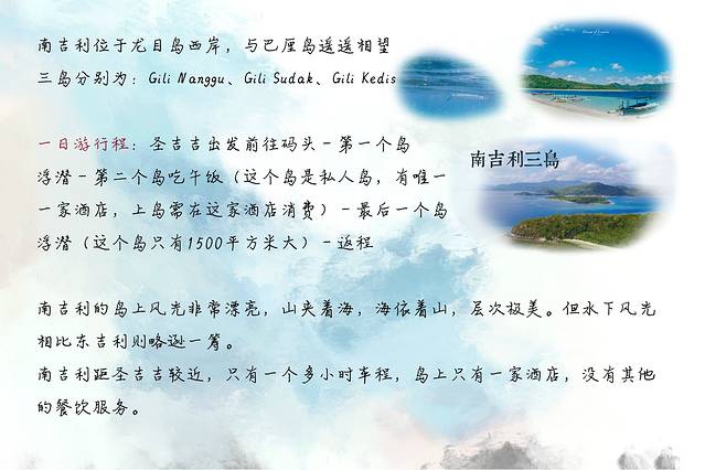东吉利、南吉利、北吉利、粉沙、selong belanak,各需要至少一天的时间,如果时间充裕则可以多住几天,林贾尼火山从圣吉吉往返至少需要3天时间,所以有些朋友说想要一天之内玩几个地方是完全不可能的。