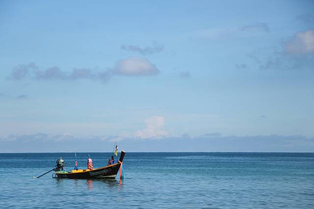 早上的卡伦海滩,游客变稀少了,海浪声被放大,还有一艘小船,变成美丽的影像。