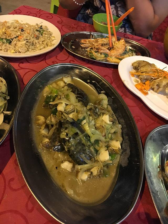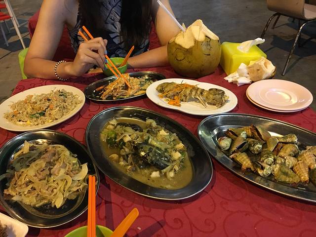 一身湿乎乎的回到镇上,还好这边很热。到傍晚了镇上就会有很多当地的人拿着桶找你买海鲜,其实卖的都蛮便宜的啦。你不要他一开价你就同意买,当地的人大多比较穷的。他看见你没有要买的意向,就会不停的降低自己的价格。越晚买到的越便宜而且都是很新鲜的,人多一起去的话可以这样买找个餐馆帮加工,一般每个菜的加工费是10-15rm。介于我家臭cc不吃虾和蟹我就不挣扎了。餐馆随便点点吃得了。