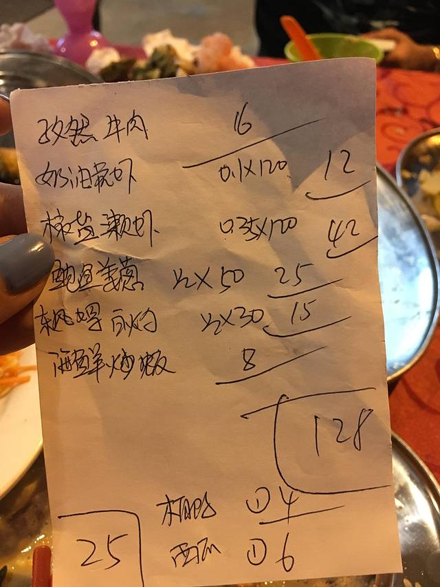 这个是买单的票,皮皮虾和老虎虾这些都按重量算钱。一共吃了128反正吃饱了。