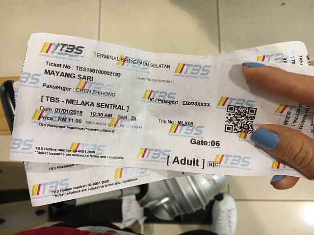 早上起床吃了个早餐然后checkout,用grab打了个车去TBS车站 (Terminal Bersepadu Selatan)。不是很远之前问接机的司机第二天从酒店送我们到TBS多少钱他说40rm我们用grab打车去花了15rm而且可以付现很方便的。到车站现买票买到了10:30的票,票价11RM蛮便宜的哈,全程是两个小时。我们买到的是这个车的最后两个座位了,座位很宽敞蛮舒服的就是冷。还是要强调下马来客车上的空调可以把人吹傻。记得带外套带外套带外套!!!