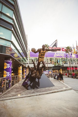 斯台普斯球场门前竖立着湖人队三个功勋球员的雕像:张伯伦,贾巴尔和奥尼尔。