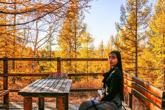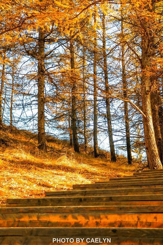 我们虽然之前走过草原天路,但是多数都是梯田的风景,即使有树林,也大多时间都在堵车,没有机会能真的走下来溜达,进入塞罕坝之后,两边都是金黄色的林场,时间富裕的情况下可以走走停停,看到好的风景也能停车拍照。