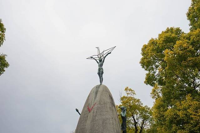 羽鹤纪念碑当地人民把它叫做原爆之子像,这座纪念碑是纪念那些死于原子弹爆炸的儿童。长圆纪念碑顶端站着一个小女孩塑像,她双手高高托着一只大纸鹤,踏着庄严的步伐,在明亮的阳光中,她向前凝望,仿佛那幸纪念碑下,有一堆数以万计的纸鹤。