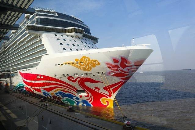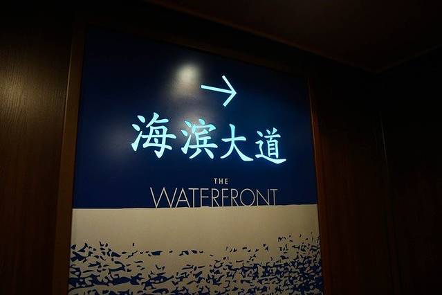 过境后,走到长廊,透过玻璃就能看到游轮的大logo,特别美,听说是由著名艺术家谭平先生设计,船体画灵感来自于凤凰。 登船前在长廊里护照会被收掉,登上船的那一刻就只有一个船卡,所有的消费都会记在卡上。