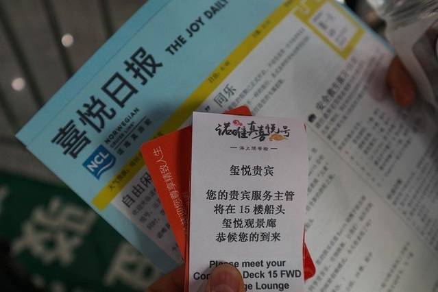 拿到卡之后会给你一份喜悦日报,这个报纸每天都会有,上面写了游轮每天的活动以及购物等优惠信息,只要待在游轮上,就要保持关注,不要错过哟(前一晚就会送到你的房间)。另外玺悦套房和The Haven套房是有专属的贵宾服务主管,并且登船和下船安检的时候都有优先权。