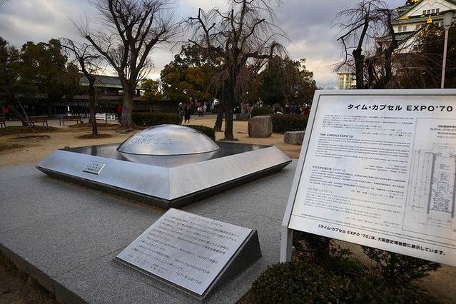 天守阁以南约100米的地方有一个有意思的东西,是1970年大阪世博会时埋在这里的两个“时间胶囊”,里面装有作为20世纪现代文明的标志性作品,定于5000年后打开,好是神奇啊。