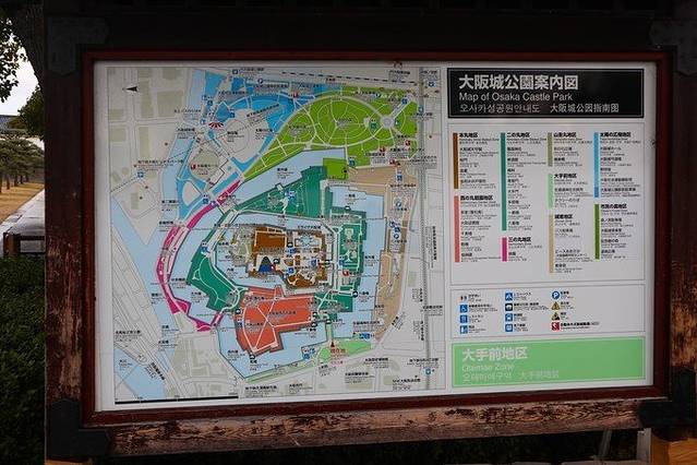公园内耸立的大阪城天守阁非常著名,最初是日本战国时期由大名丰臣秀吉修建,城墙是由每块重达一吨的巨石修砌而成,天守阁内部陈列了众多日本将军的影像、人偶和建筑模型等资料,讲述了日本的风云历史。登上天守阁最高处第8层,可以眺望大阪的市景,城顶的八只鯱和装饰用鬼瓦以及虎状的浮雕,全部镀金而成。