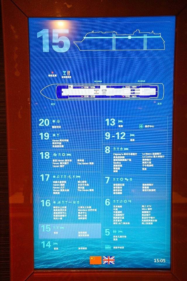 船内有6个电梯,电梯口有一面游轮结构显示屏,你可以进行一次初步的全船预览,了解下这边的餐饮 娱乐等地点,方便在船上的活动。