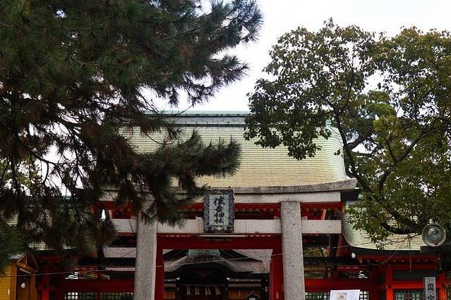 神社内还有座桥,呈大鼓形,橘红色的桥身配上周围绿色的古树,非常古朴,横跨在院内池上,每到夜晚,灯光打在桥上非常特别,来到神社必去的地方。