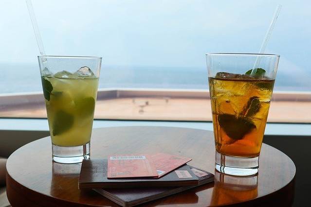游轮在行驶的时候室外还是比较凉的,我们还是来到了中庭,在酒吧各点了一杯无酒精鸡尾酒。让调酒师刷卡的时候最好提示一下是使用畅饮的,不然在忙的时候很容易搞混。