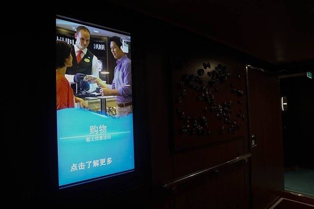 到了玺悦套房入住的楼层,楼梯口有一个显示屏,这个每层都有,是触屏的,你可以随时随地了解船上的活动信息,以及消费娱乐指南。