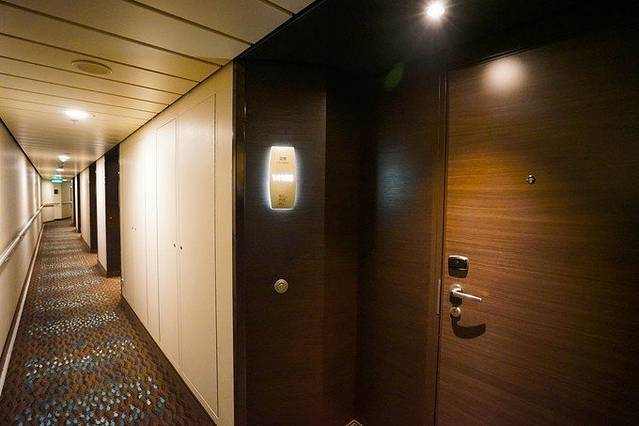 先要过行李安检,办理托运,不论是已经拿到房卡还是没办理的都可以托运,只要告知自己的房间号就行,服务员会将你的行李送至你房间门口。我们的行李箱不大,所以就自己拿着了,这样也方便。到了12点半的时候,大厅里全是人,排着队,还算井然有序,凭护照自行办理船卡,先会在护照上贴上标签和房号,然后到另一个柜台取卡,房间里的所有人都会有一张卡,船卡上有客人的名字。不同房型卡的颜色不一样,黄色卡是普通客房,橙色卡是玺悦套房(我们拿的就是),黑色卡是The Haven套房。
