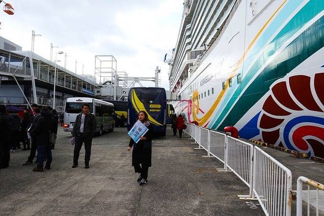 游轮抵港后,我们根据票上安排的时间到指定的地点集合,票上有乘坐的巴士号码,就是这次团队的号码,领队会帮你贴一个标签,以防走丢。对了,这里提醒大家千万别忘了房卡和护照复印件,只有凭这些材料才能上下游轮。大约等了一个小时,所以人员都齐了,才一个队一个队地出发。